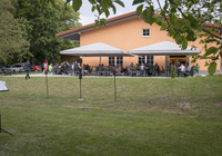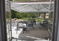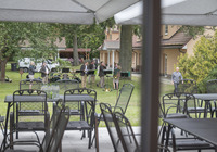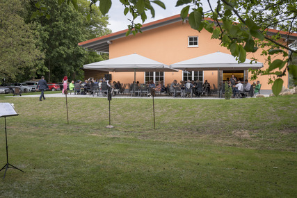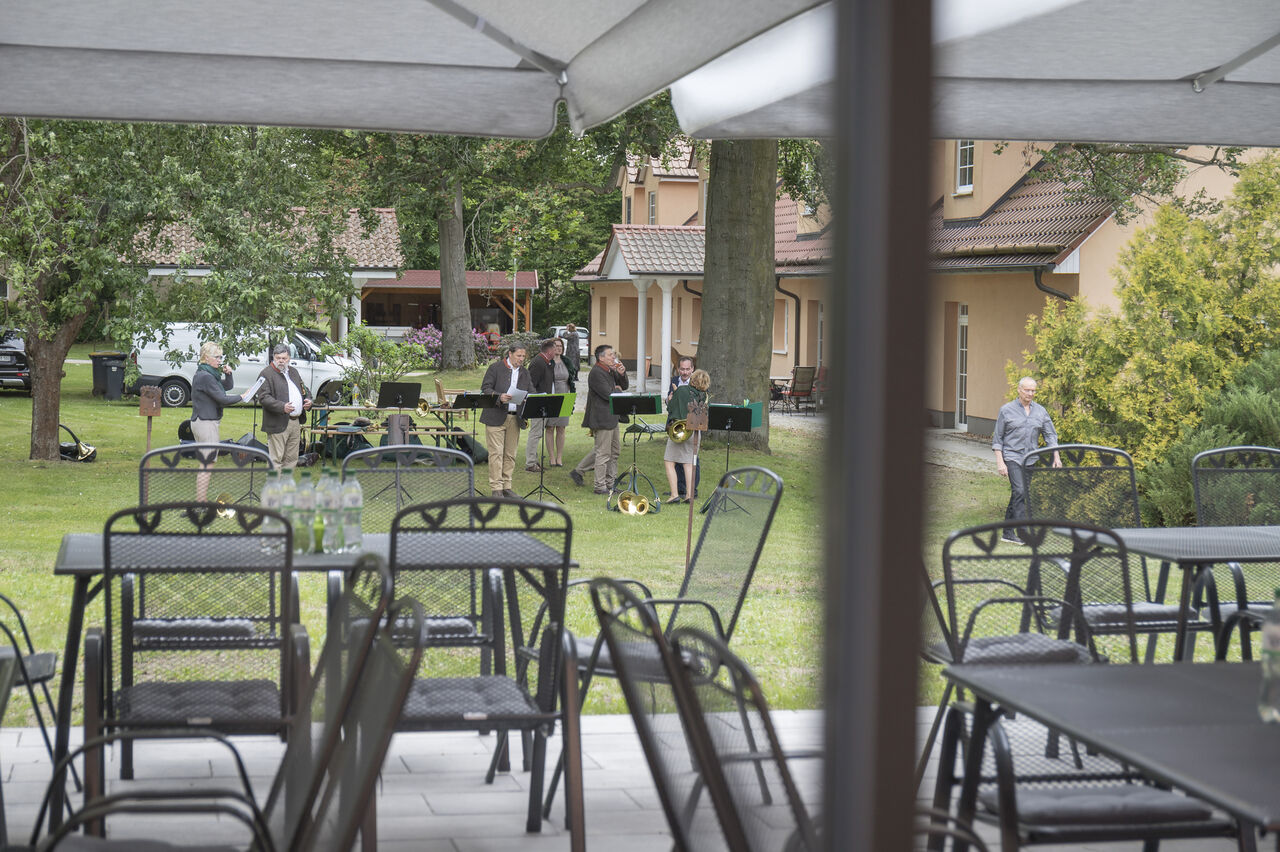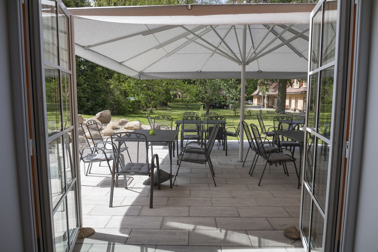 Mit dem Blick auf unseren kleinen Park mit altem Baumbestand fühlt man sich der Natur verbunden. Dieses Ambiente eignet sich hervorragend für Familienfeiern, Touren oder Firmenevents.